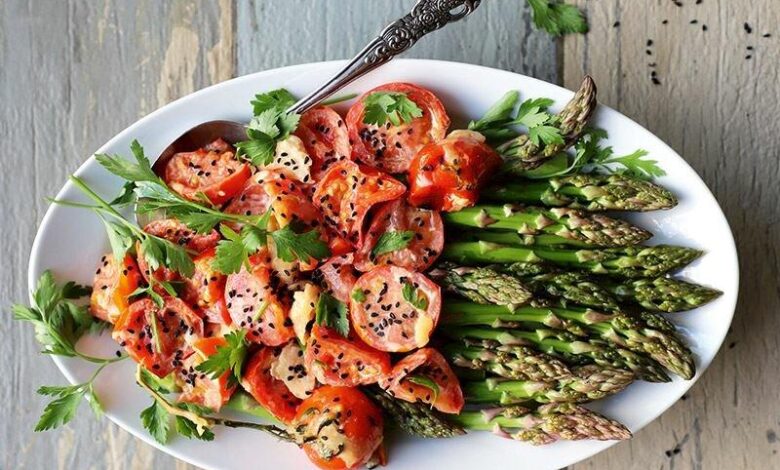- Kuşkonmazları zeytinyağı, limon ve bir tutam tuz ile harmanlayıp servis tabağına alın. Üzerine peynirli domatesleri yerleştirin. Maydanoz ve çörekotu ile süsleyerek servis edin.