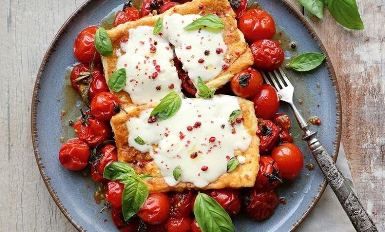 - Peynirler eriyince kadar pişirmeye devam edin. Servis tabağına alıp fesleğen ve pembe biber ile servis edin.