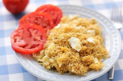 3. Süt yumurta yağ ve rende kaşarın yarısı çırpılır kadayıflı karışıma eklenir.