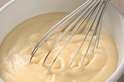 1. Bir tencereye yumurtayı,unu ve şekeri koyun.Üzerine suyu yada sütü yavaşça ekleyerek karışımı ezin.