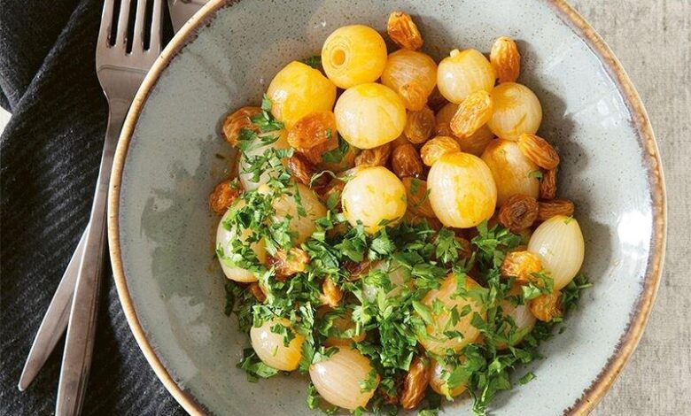 - Arpacık soğanları, üzüm sirkesini, zeytinyağını, toz şekeri, domates püresini, defne yaprağını, kuru üzümü, tuzu, karabiberi ve suyu bir tencereye aktarın.
